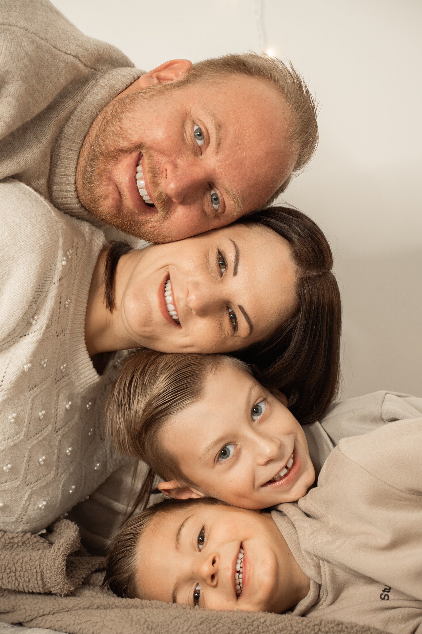Entspannte Fotos mit Baby (ab ca. 2–3 Monaten), Geschwistern und Eltern, natürliche Familienbilder bei euch zu Hause.